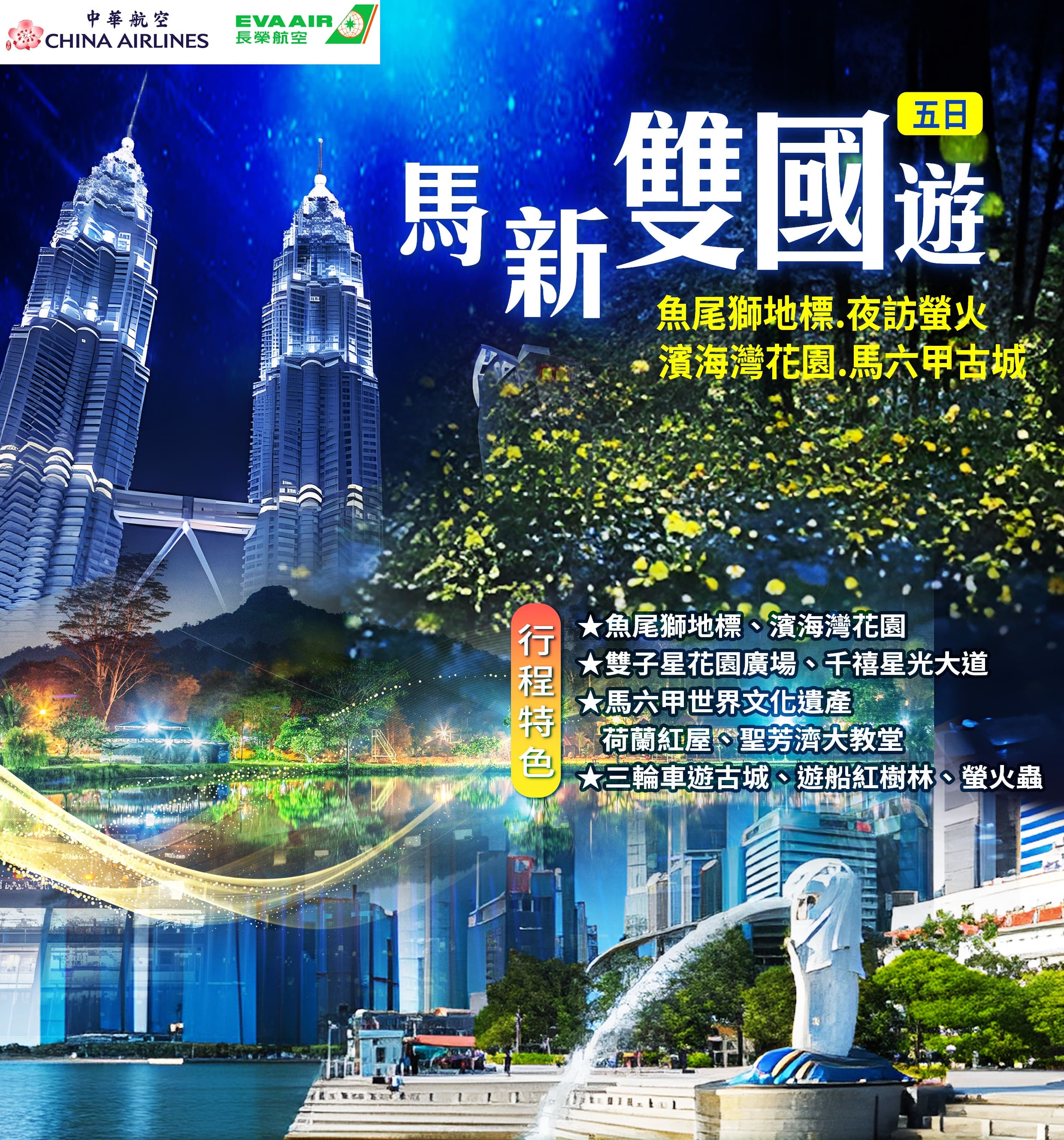 【馬新經典雙國遊】魚尾獅地標.濱海灣花園.馬六甲古城.夜訪螢火蟲秘境五日