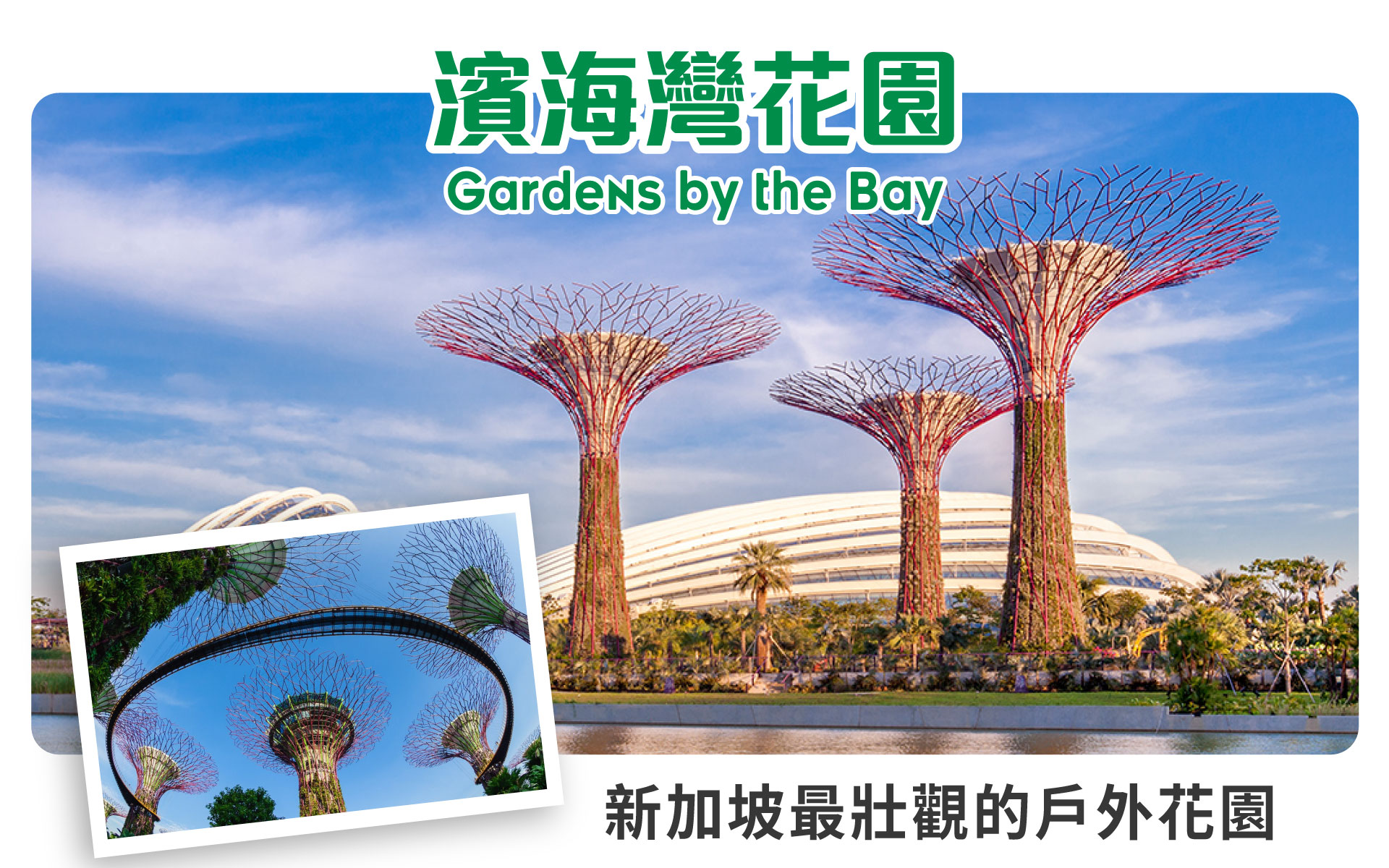【濱海灣花園(超級樹)】位於新加坡河的河口延展開來,由三座海濱花園所組成,分別是濱海南花園、濱海東花園、濱海中花園。規模最大的濱海南花園將位於濱海灣金沙的旁邊,並以各種熱帶花卉和不同色彩的植物展現出精湛的熱帶園藝和園林藝術。